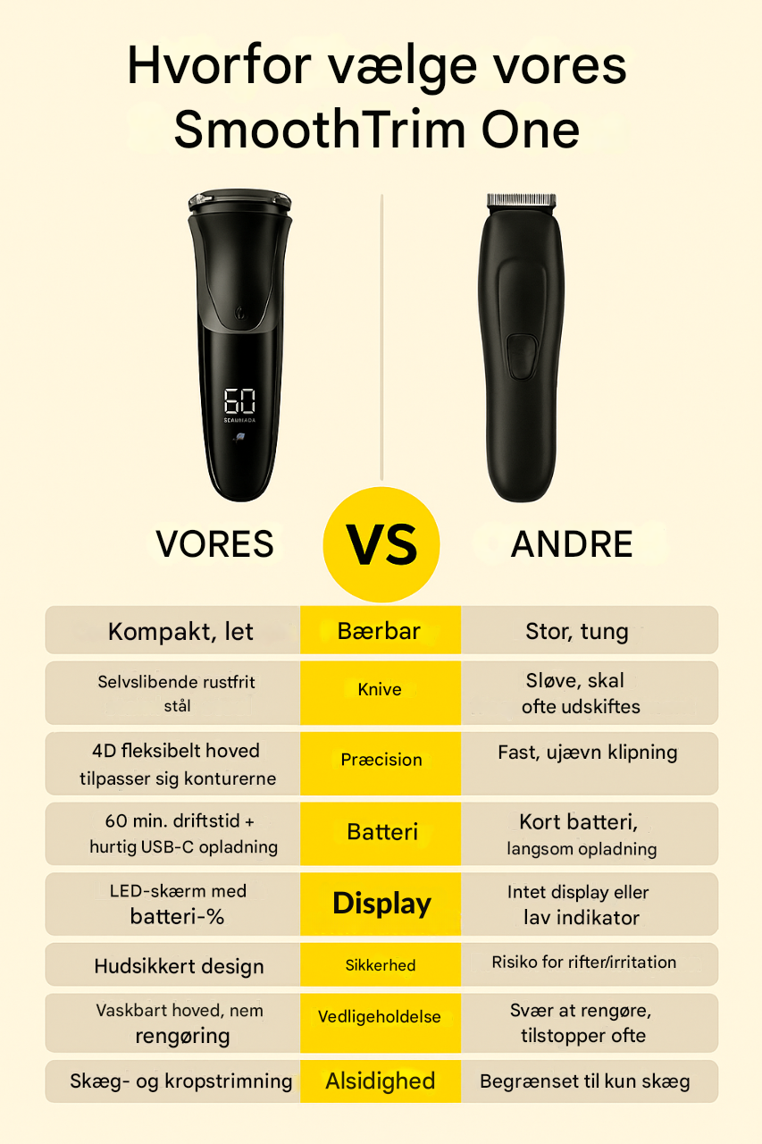 Smoothtrim one er designet til en ubesværet barbering. Med sine 4D-flydende hoveder og skarpe, roterende blade tilpasser den sig alle ansigtskonturer for en glat og irritationsfri barbering på få minutter.